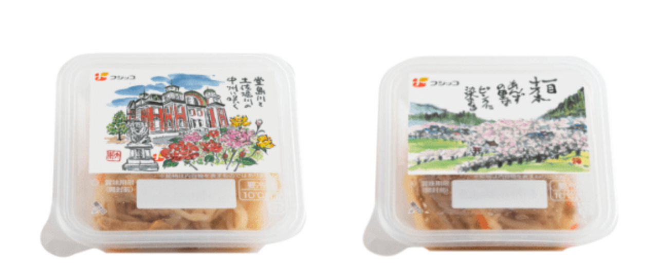 夕飯の一品に出そうと思ってラベルの帯を取ったら、絵手紙の絵が現れてとても感動しました。ただの透明のラベルよりなんか特したような、開ける楽しみが増えました、もっともっと絵手紙のラベル増やして下さい。